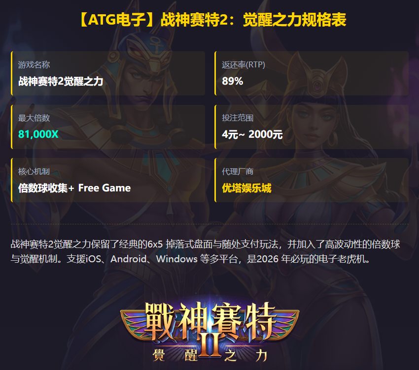 2026年,ATG电子年度最强档巨作《战神赛特2觉醒之力》终于震撼登场!这款续作不仅画面全面升级,最大爆分倍数更是一举突破天际,来到惊人的81000倍。许多资深玩家都在问:该如何提高胜率?本篇独家攻略将为您揭密高胜率的选台技巧,教您利用数据面板避开咬分坑杀。同时,我们也会深入解析觉醒讯号的判断逻辑,让您学会辨识「荷鲁斯之眼」与「倍数球」发出的进场征兆,精准捕捉机台的黄金吐分期。不想一开始就拿本金冒险?没问题!小编也帮大家附上了战神赛特2觉醒之力的原厂免费试玩连结,建议您先透过试玩版熟悉节奏,零成本体验81000倍的赛特觉醒爆发快感!