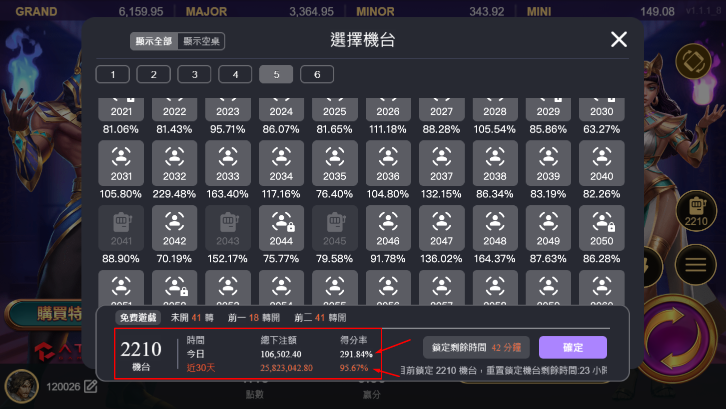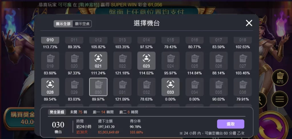 戰神賽特2選台就是由 ATG 電子獨家打造的「自由選台系統」。戰神賽特2不像一般老虎機一按開始就直接進入遊戲,而是能讓玩家挑選(如 RTP返還率、未開次數、爆分間隔等),再決定要不要進入遊玩。這代表玩家可以預判這機台是「吃分期」還是「吐分期」,挑選適合自己的機台提升勝率。
